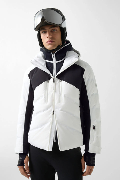 The weather-resistant Jervis ski jacket made from technical 4-way stretch with functional quilted sections, a durable water-repellent finish and comfortable down padding offers pure performance on the piste. The detachable hood and hem with drawstring and Cohaesive technology provide a casual upgrade.