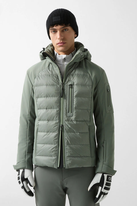 The Zoran softshell ski jacket boasts a design mix with 4-way stretch sections and a quilted ripstop front with goose down and feather padding. The hood with drawstring, the underlaid two-way zip and mesh inserts under the sleeves ensure comfort. Subtle logo details accentuate this modern winter sports piece.