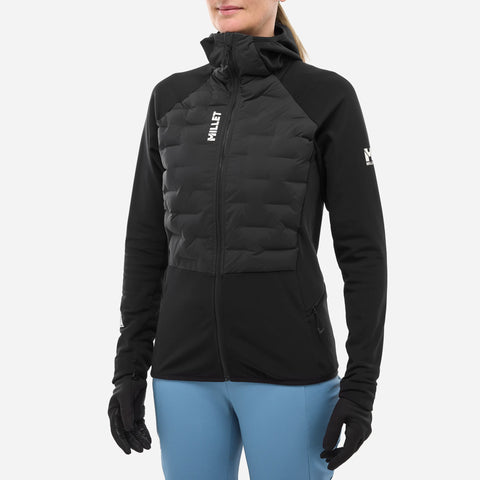 We're moving at a steady pace. Our PIERRA MENT HYBRID ski touring jacket protects us effectively from the cold and wind while ensuring great breathability thanks to its hybrid construction. The new Synth'X™ technology has been developed to ensure maximum efficiency, even in wet weather. This technology is combined with PrimaLoft® ThermoPlume insulated panels and lighter Carvico® stretch mesh zones.