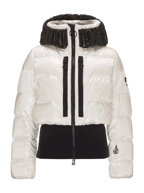 Light, warm and fashion. With 100% certified down insulation the BERNADETTE jacket creates a very fashy puffy look on the slopes and in the resorts. Loose fit optic meets slim fit! The YKK® 2-way METALUXE® front zipper, the glossy bonded logos and the special shiny chamber look fabric for the hood make the BERNADETTE so progressive.
